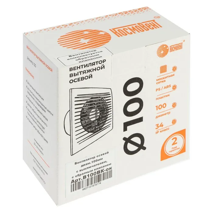 Вентилятор вытяжной "КосмоВент" В100ВК-ок, d=100 мм, 10 Вт, 105 м³/ч, с выключ, обр. клапан — Характеристики