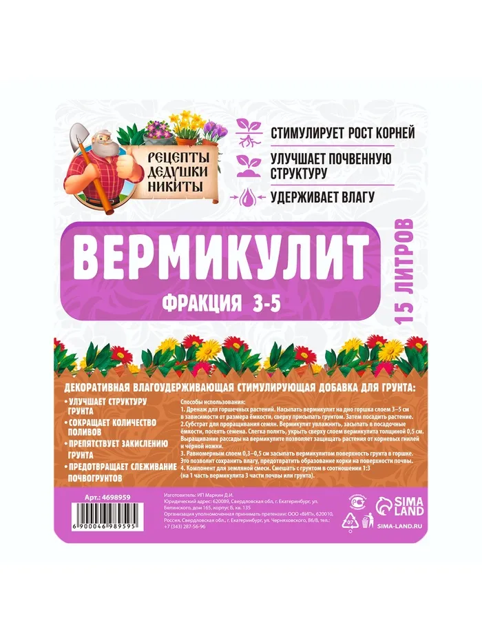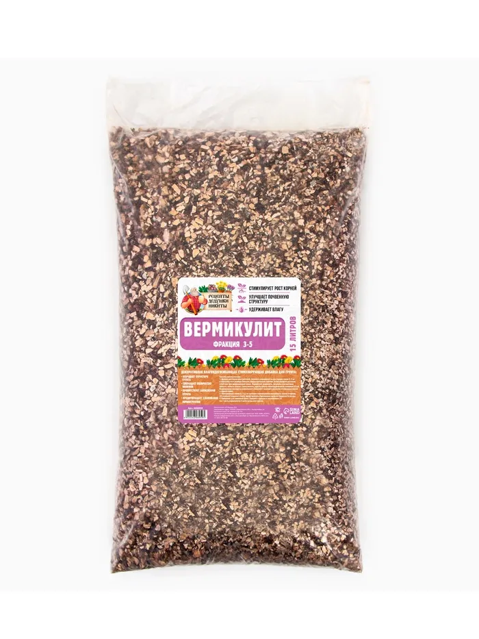 Вермикулит «Рецепты Дедушки Никиты» фр 3-5, добавка в грунт, для рассады, для комнатных растений, 15 л. — Характеристики