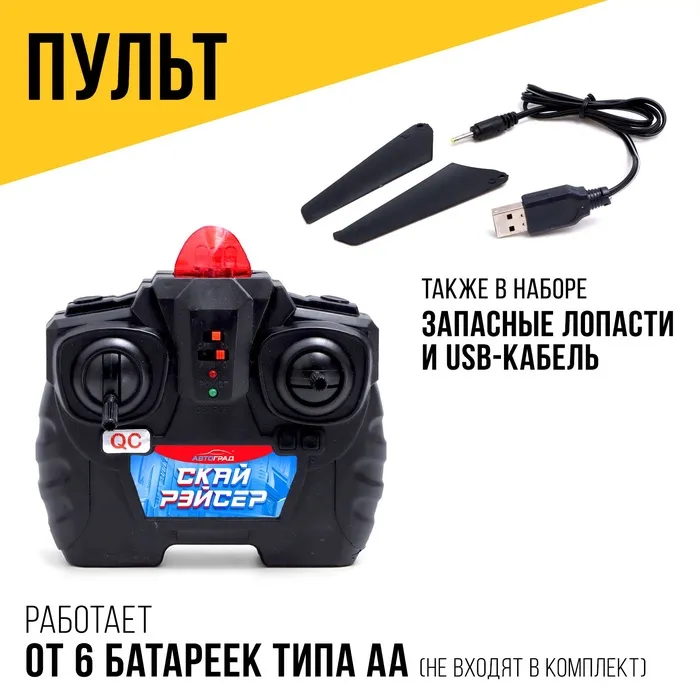 - Вертолёт работает от аккумулятора и заряжается от USB.