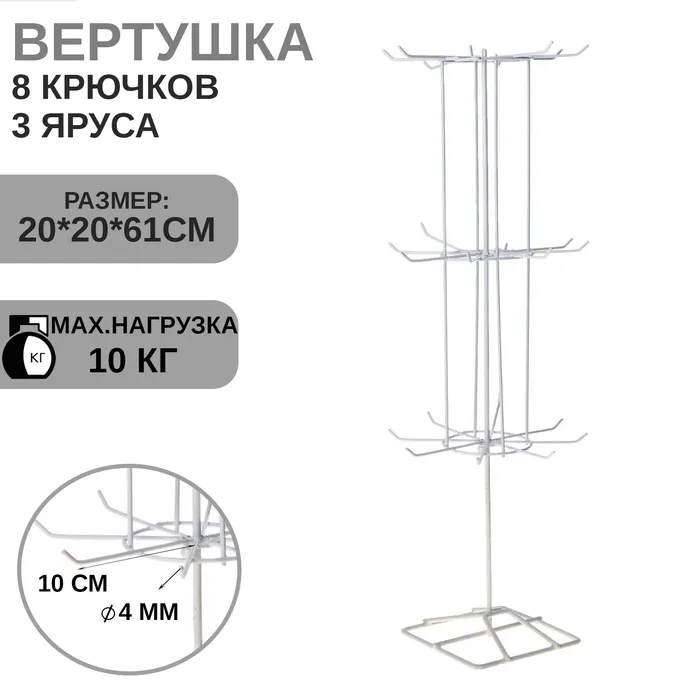 Вертушка, 3 яруса по 8 крючков, 20×20×61, цвет белый — Характеристики