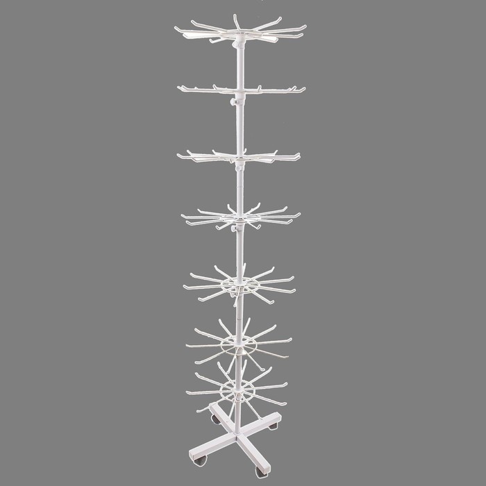 Семь ярусов по 10 крючков каждый обеспечивают удобную организацию и доступность ваших товаров. Вращающаяся конструкция позволяет легко и быстро просматривать и выбирать украшения. Вертушка белого цвета — это идеальный выбор для магазинов, выставок или домашнего использования, сочетая функциональность с элегантным дизайном.