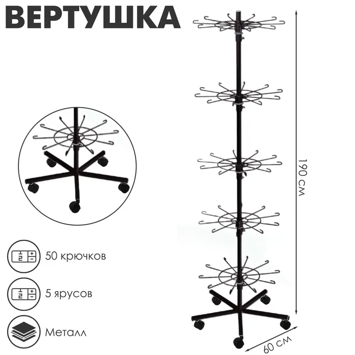 Вертушка на колёсах, 5 ярусов по 10 крючков, 60*60*190, цвет чёрный — это удобный и функциональный аксессуар для организации пространства в магазинах, выставках или дома. Благодаря пяти ярусам, каждый из которых оснащен десятью крючками, вы сможете удобно разместить различные товары или аксессуары, обеспечив порядок и легкий доступ к ним.