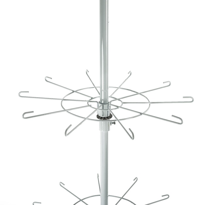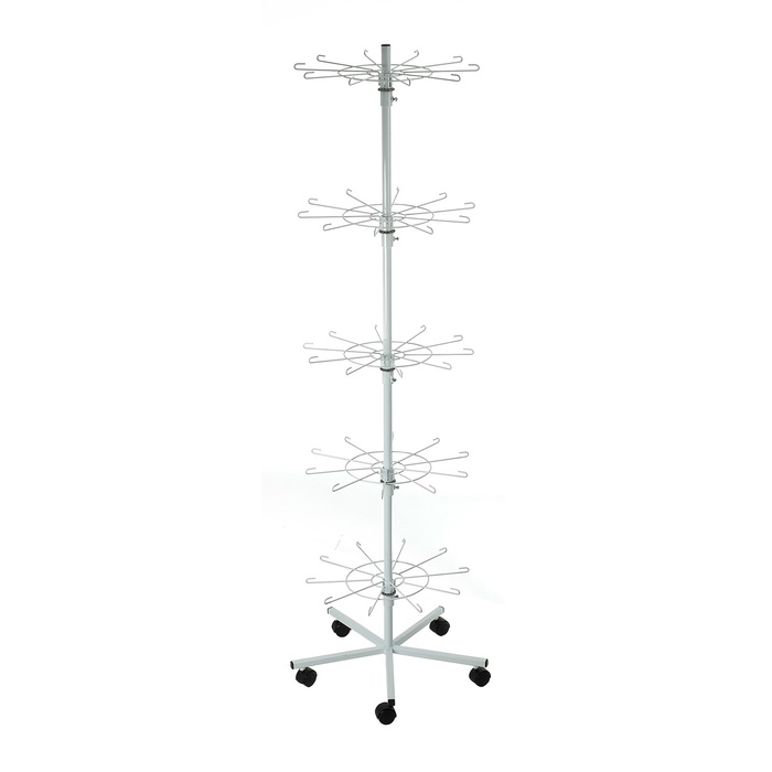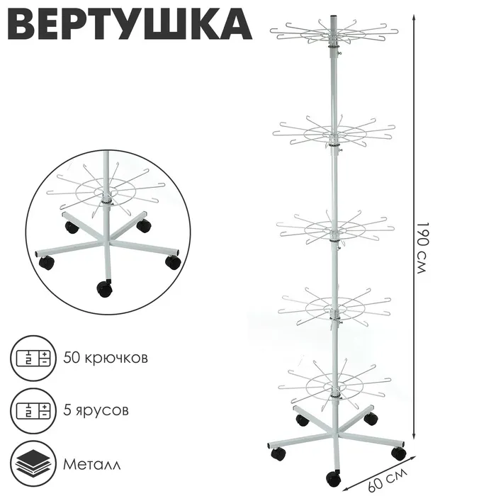 Каждый из 5 ярусов снабжен 10 крючками, обеспечивая достаточное количество мест для размещения товаров, что делает эту вертушку идеальным выбором для коммерческих помещений, выставок и торговых залов.