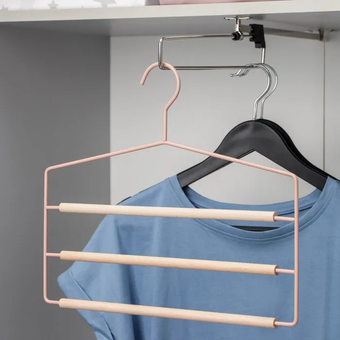 Вешалка для брюк – это компактное приспособление, которое позволит вам разместить в гардеробе классические штаны из лёгких или плотных материалов. Изделие практичной формы занимает мало места, что позволяет экономить пространство в шкафу/
