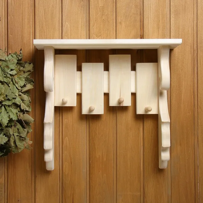Баня, как и театр, начинается с вешалки. Повесьте изделие у входа полку, чтобы все было на своих местах. Прочные крючки могут выдержать большую нагрузку. Легко крепиться к стене гвоздями или саморезами.