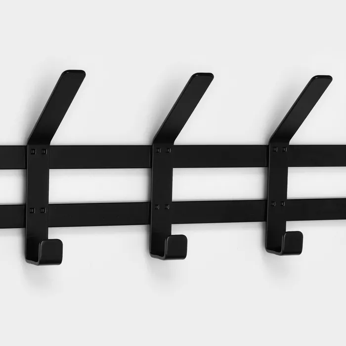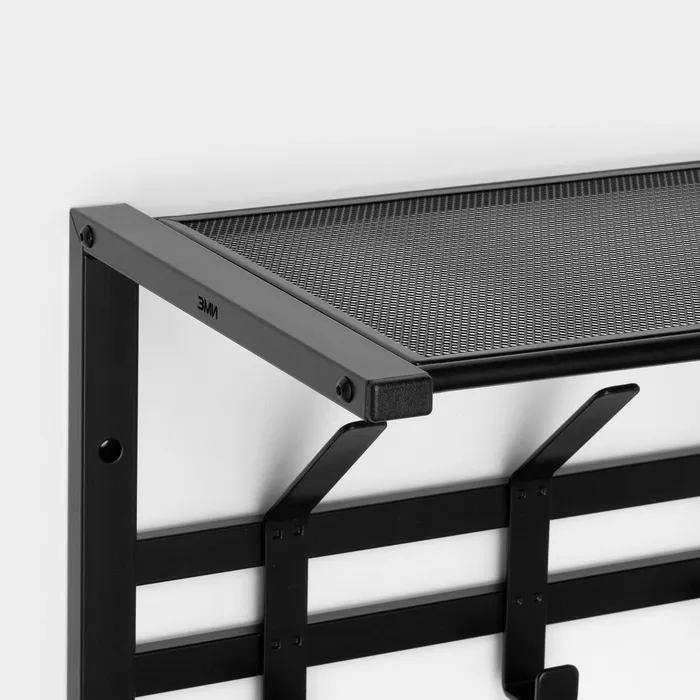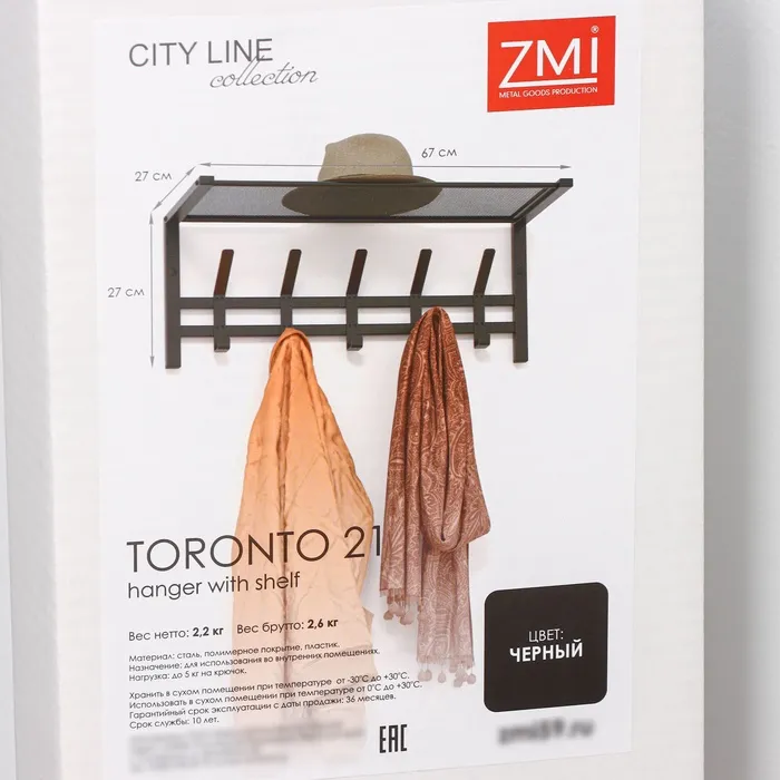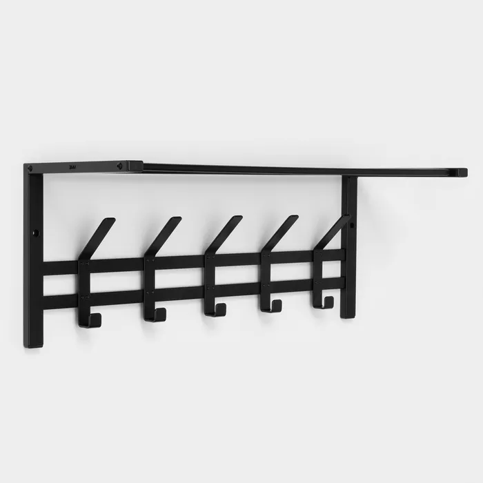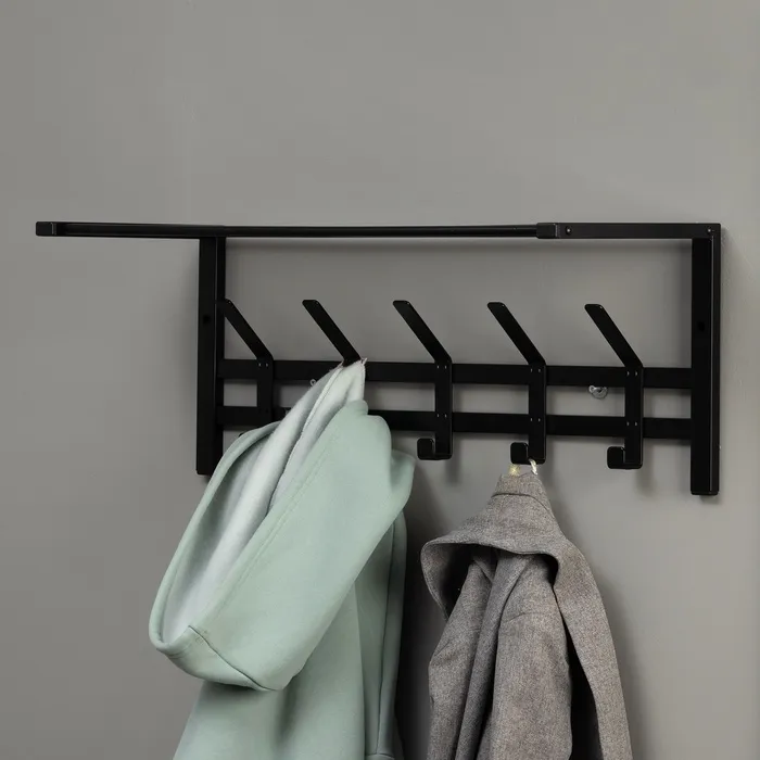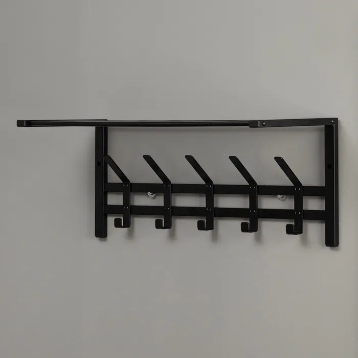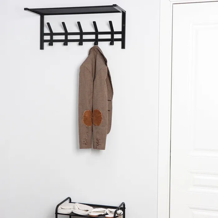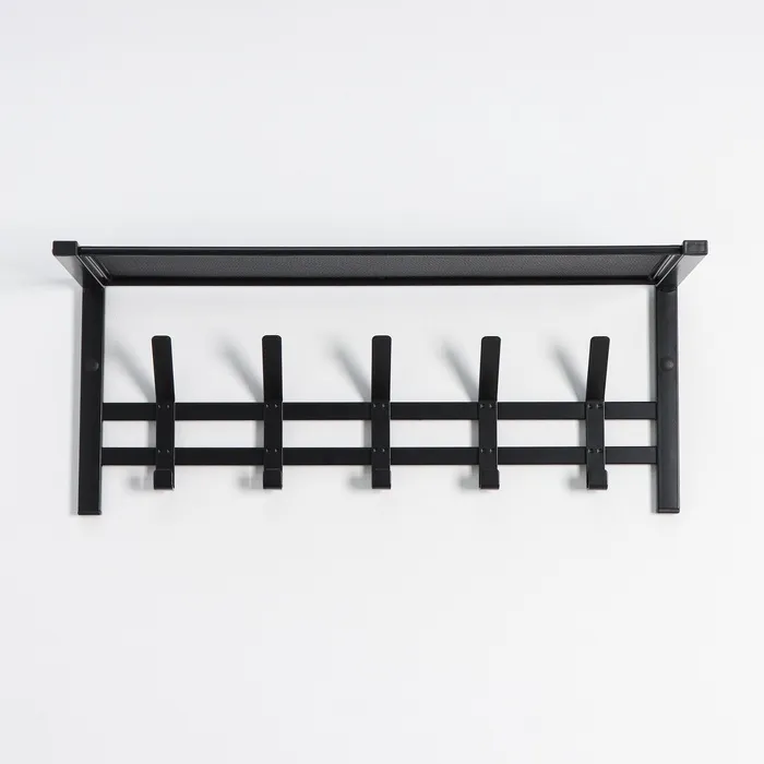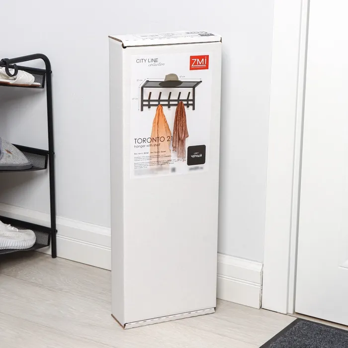 Вешалка оснащена 5 двойными крючками и полкой. На полке можно разместить головные уборы, шарфы, полотенца или же повесить зонт.