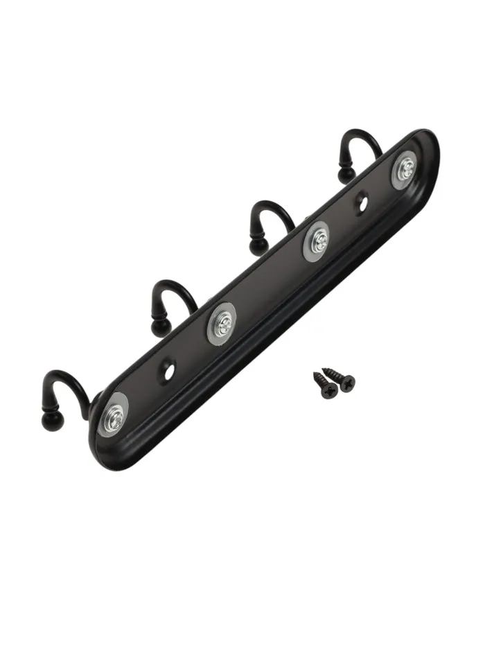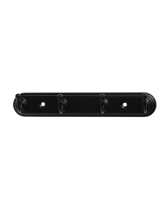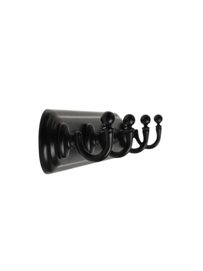 Металлическая вешалка с четырьмя рожками черного цвета для практичного хранения одежды. Современное решение для организации пространства в прихожей.