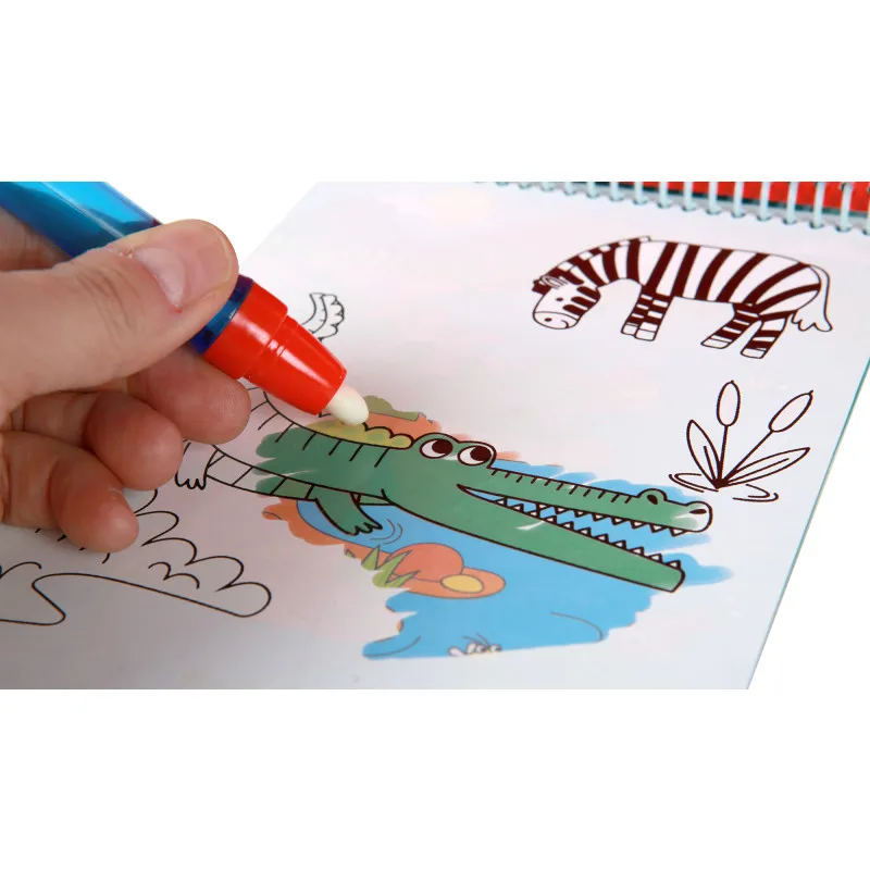 Эта уникальная раскраска позволяет вам снова и снова раскрашивать картинки с животными сафари. Просто наполните ручку водой и начните раскрашивать. Цвета и узоры мгновенно появляются на страницах. Когда изображение высыхает, страница становится снова белой. Идеально для путешествий!