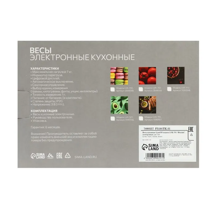 Весы кухонные Luazon LVK-701 "Италия", электронные, до 7 кг — Характеристики