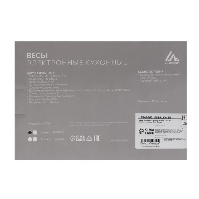 Весы кухонные Luazon LVK-702, электронные, до 7 кг, белые — Характеристики