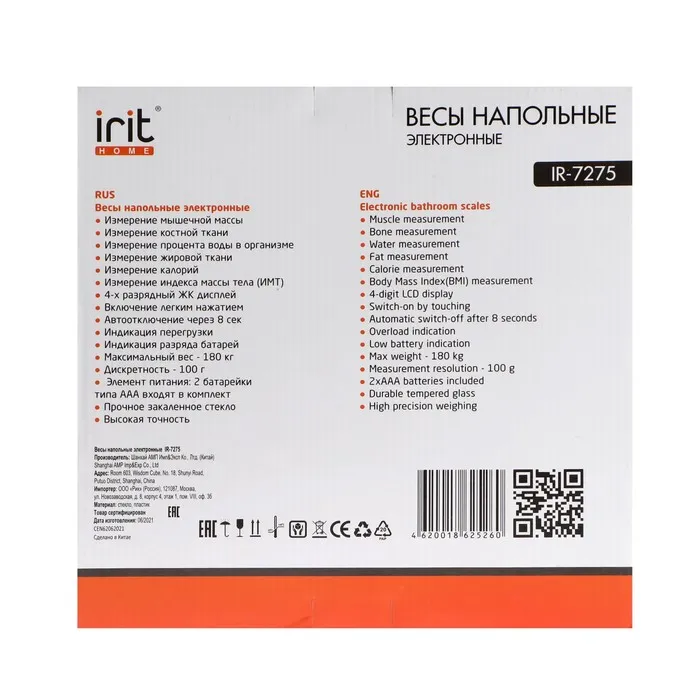 Весы напольные Irit IR-7275, диагностические, до 180 кг, 2хААА (в комплекте), белые — Характеристики