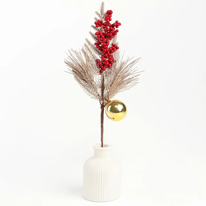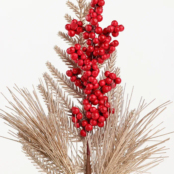 Новогодний декор «Веточка золотая с ягодками» — это объёмное и стильное украшение для вашего дома. Веточки ели удобно хранить благодаря легкому весу. Их можно использовать для украшения дверей, окон, столов или подарочных упаковок на Новый год или Рождество.