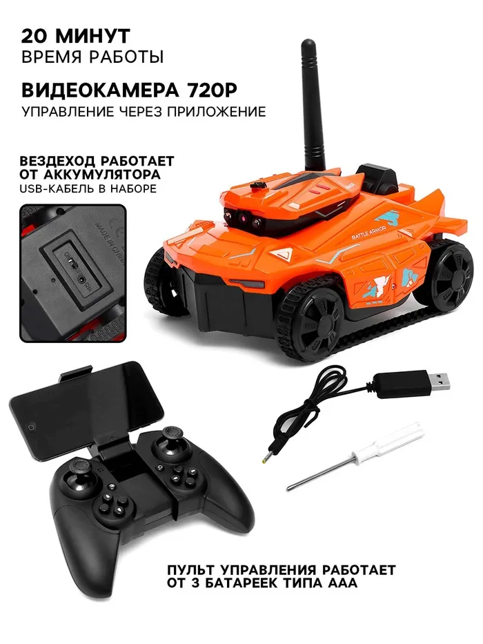 Вездеход радиоуправляемый «Шпион» с видеокамерой, управление с телефона, свет, цвет оранжевый — Характеристики