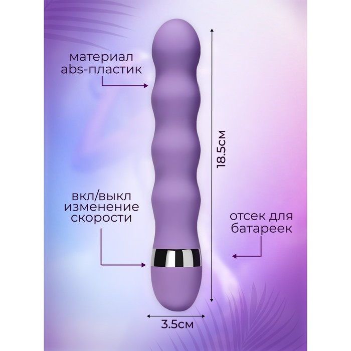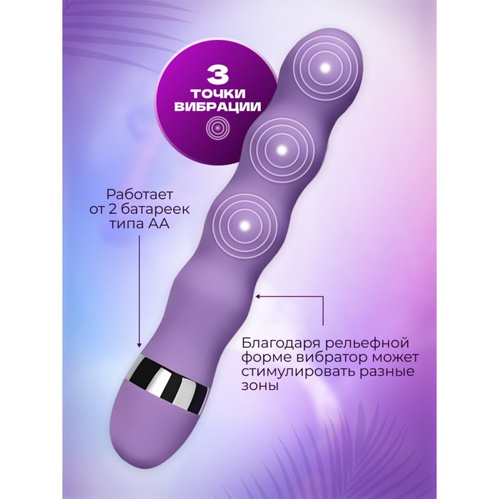 Рельефный вибратор из гипоаллергенного ABS-пластика отлично подойдёт для начинающих. Благодаря рельефной форме вибратор может стимулировать разные зоны, подходит как для неё, так и для него. Игрушка имеет три точки вибрации, за счёт этого стимуляция будет более интенсивной. Благодаря тумблеру можно регулировать интенсивность вибрации. Вибратор водонепроницаем. это позволит брать игрушку с собой в душ. Питание от 2 батареек типа АА, в комплект не входят. Перед использованием необходимо помыть игрушку под проточной водой, далее обработать специальным спреем -клинером. Рекомендуется использовать с лубрикантом, дополнительная смазка обеспечит приятное введение игрушки во внутрь.