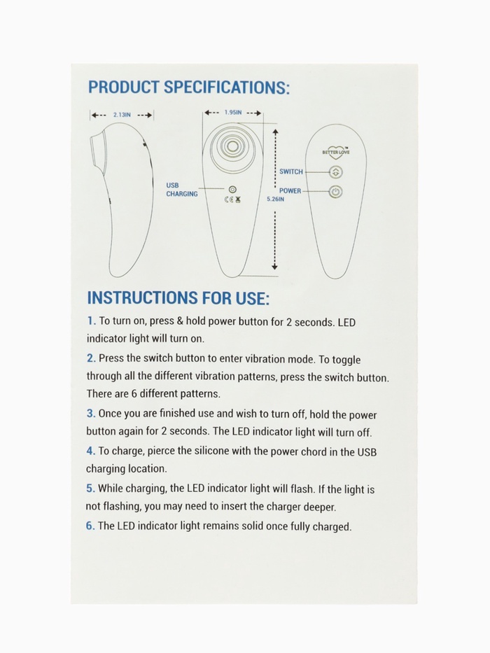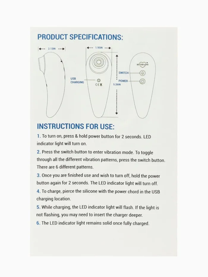 Игрушку можно использовать для стимуляции разных зон, таких как: соски, клитор, половые губы. Бесконтактная вакуумная стимуляция клитора обеспечит быстрый и яркий оргазм. Игрушку можно использовать как во время секса с партнёром для дополнительной стимуляции отдельных зон, так и в соло.