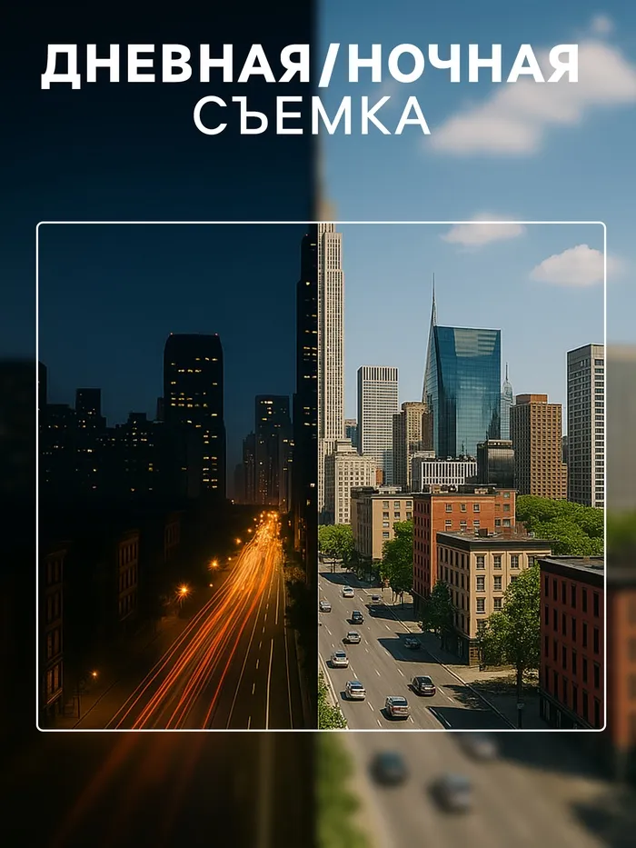 - Круглосуточная защита: функция "день/ночь" позволяет камере работать в любое время суток, обеспечивая безопасность даже в темноте.