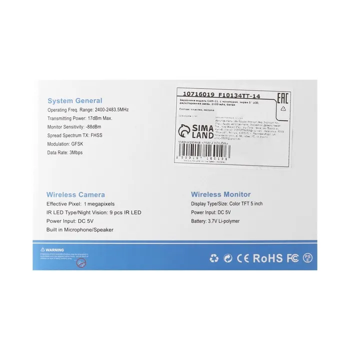 Видеоняня беспроводная с монитором, экран 5" LCD, двухсторонняя связь, 2100 мАч, белая — Характеристики