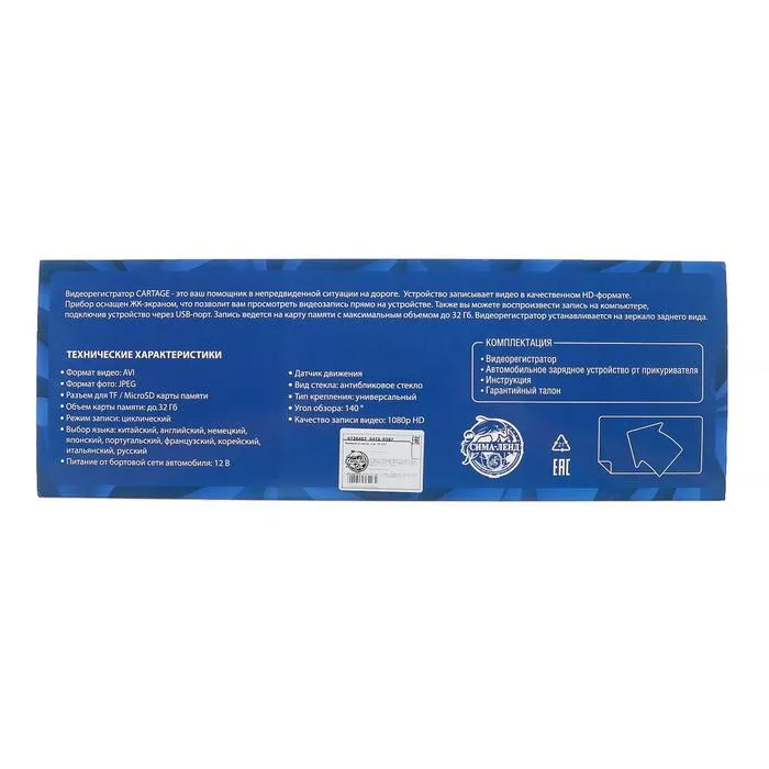 Видеорегистратор CARTAGE - это ваш помощник в непредвиденной ситуации на дороге. Устройство записывает видео в качественном HD формате. Прибор оснащен ЖК экраном, что позволяет вам просмотреть видеозапись прямо на устройстве. Также вы можете воспроизвести запись на ПК подключив устройство через USB порт. Запись ведется на карту памяти с максимальным объёмом до 32 Гб. Видеорегистратор устанавливается на зеркало заднего вида.