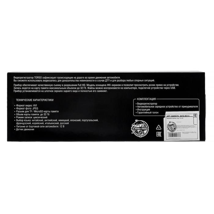 Видеорегистратор TORSO, 2 камеры, HD 1080P, размер 31х8 см, TFT 4.3, обзор 120° — Характеристики