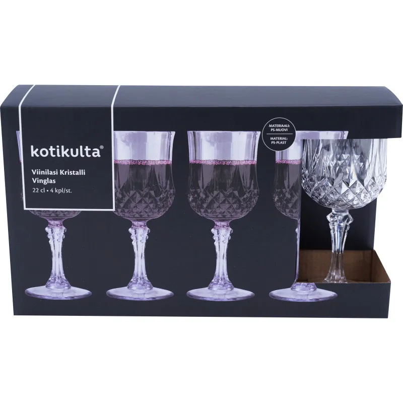 Пластиковые бокалы для вина Kotikulta с красивым кристаллическим узором на поверхности станут практичным решением для различных праздников. Прозрачные бокалы добавят элегантности вашему столу, сохраняя при этом удобство использования и долговечность. В упаковке содержится 4 бокала для вина.