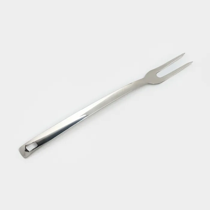 Металлическая вилка с крупными острыми зубцами незаменима при приготовлении стейков и отбивных. С этим предметом значительно легче переворачивать и извлекать куски мяса и рыбы.
