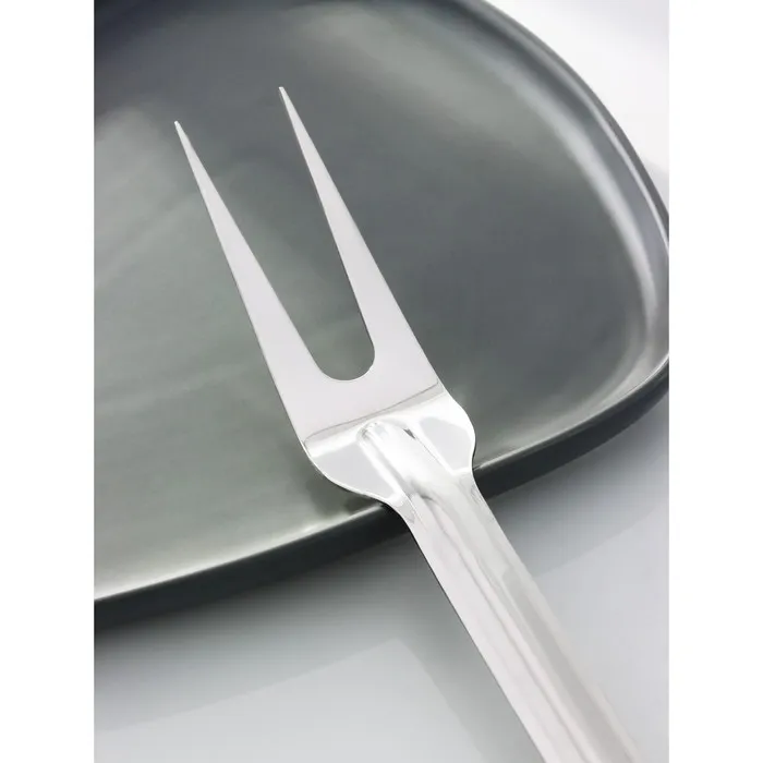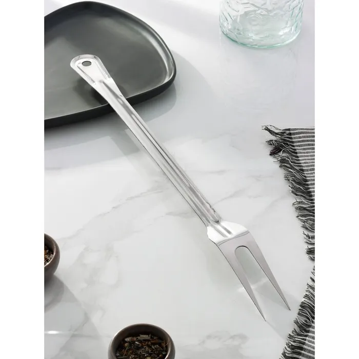Вилка из нержавеющей стали с крупными острыми зубцами незаменима при приготовлении стейков и отбивных. С этим предметом значительно легче переворачивать и извлекать куски мяса.