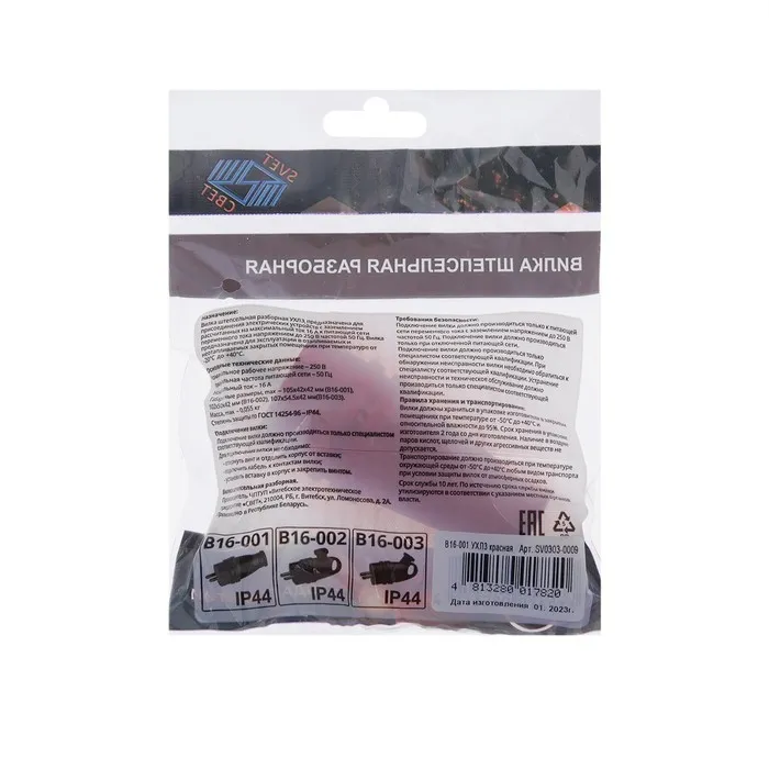 Вилка переносная В16-001, 16 А, 250 В, IP44, с з/к, каучук, красная — Характеристики