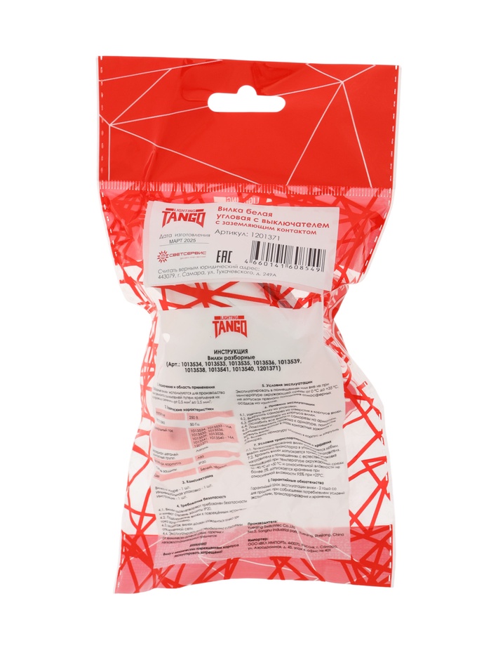 Вилка угловая с выключателем TANGO, 16 А, 250 В, IP20, с заземлением, белая — Характеристики