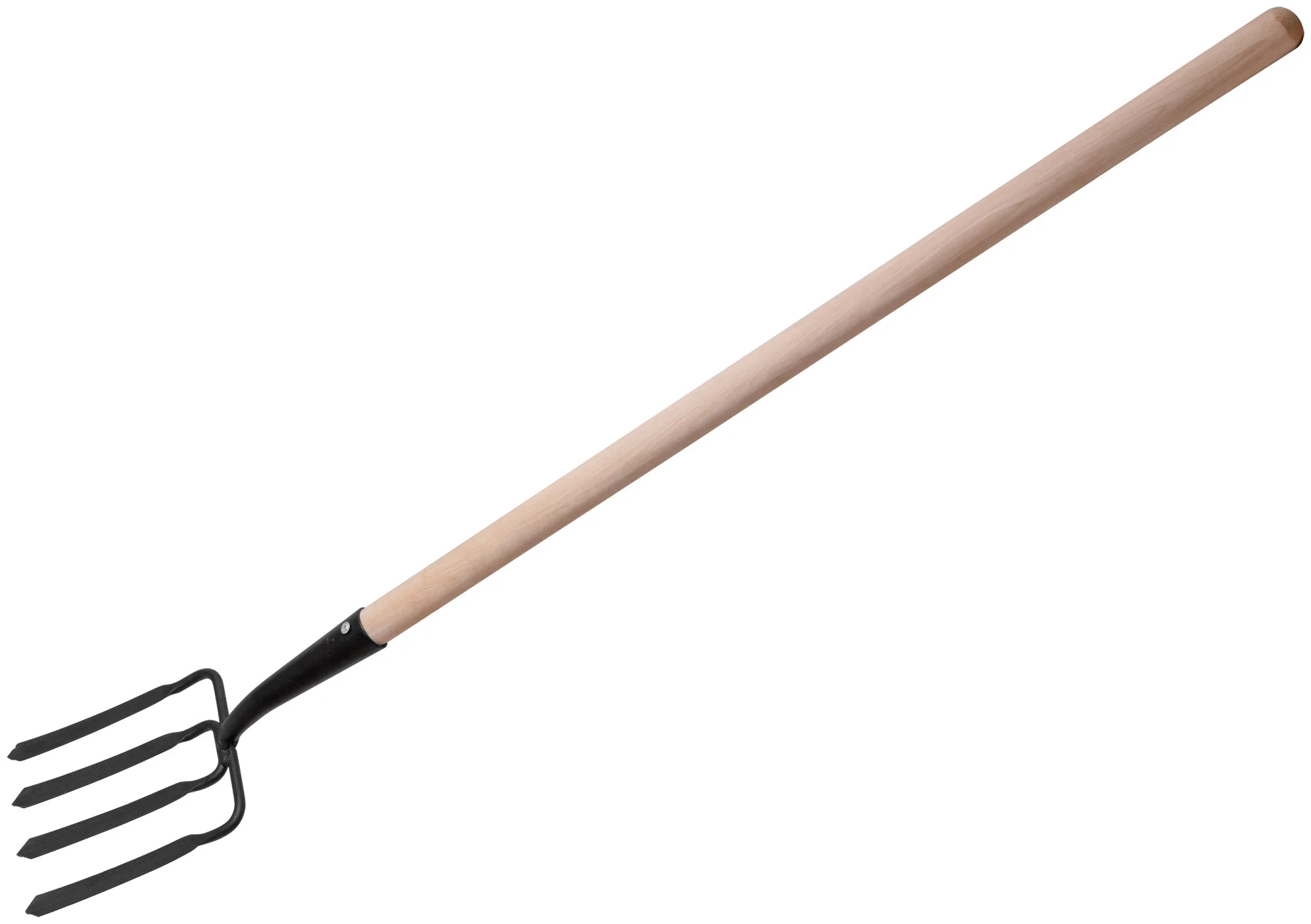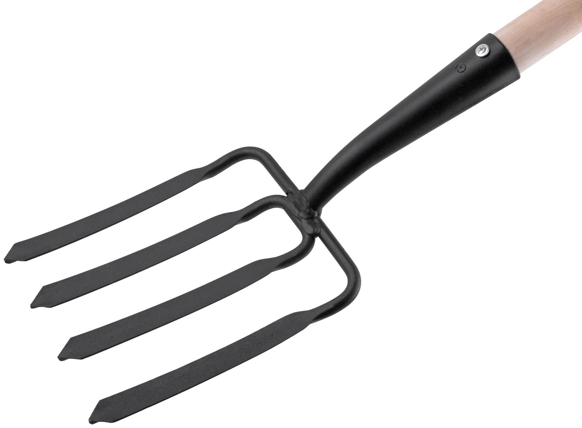 Вилы оснащены четырьмя прочными рогами из инструментальной стали, что гарантирует долговечность и устойчивость к нагрузкам. Деревянный черенок обеспечивает комфортное удержание во время работы, снижая усталость рук.