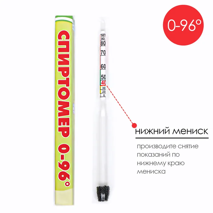 Спиртометр для вина, пива или браги представляет собой стеклянную трубку – узкую с одной стороны, широкую с другой. В широкую часть помещен груз (свинцовые шарики), а на узкую нанесены две шкалы с мерными делениями. Одна из шкал предназначена для измерения сахаристости в диапазоне от 0 до 25%, другая – для определения крепости напитка в промежутке от 0 до 12 градусов. Значения можно узнать без вычислений по границе погружения трубки в жидкость.