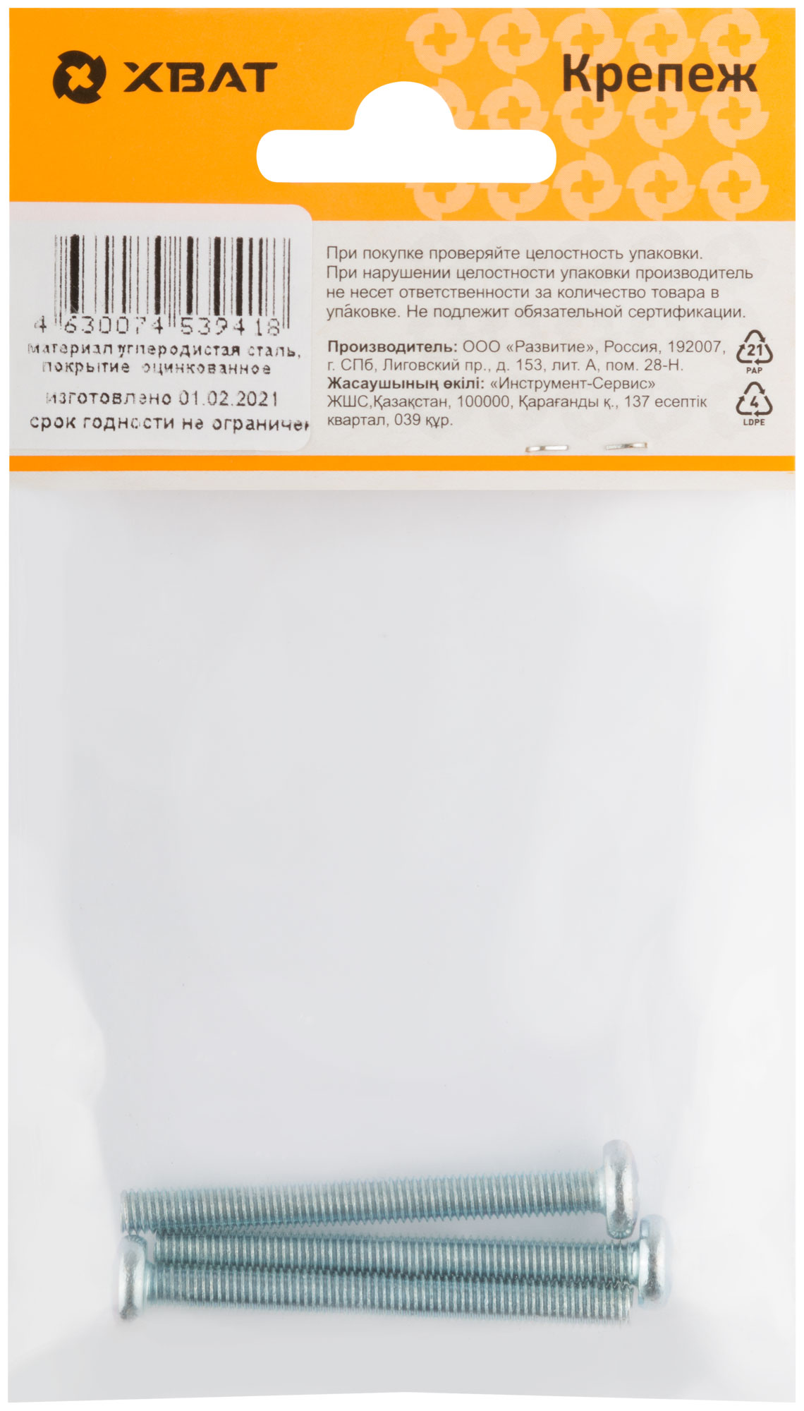 Винт с метрической резьбой и полуцилиндрической головкой с крестообразным шлицем изготовлен из стали и имеет оцинкованное покрытие, что обеспечивает долговечность и стойкость к коррозии.