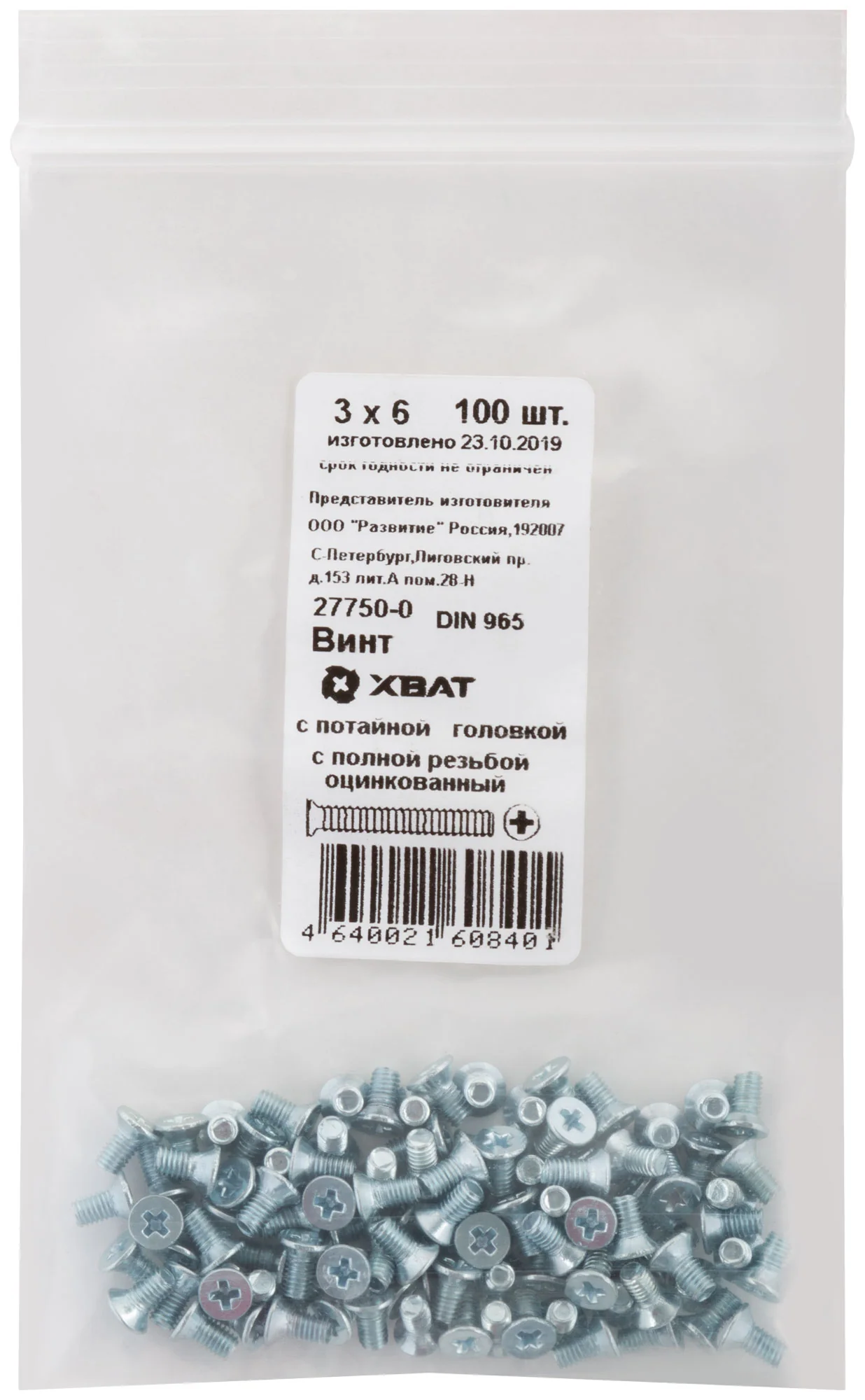 Винт с потайной головкой с полной резьбой оцинкованный DIN 965 3х6 100 шт Фасовка
