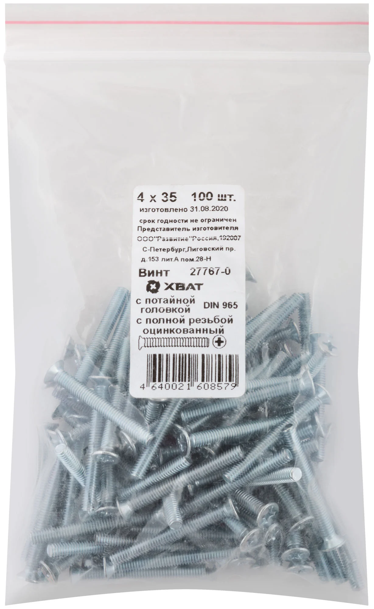 Винт с потайной головкой с полной резьбой оцинкованный DIN 965 4х35 100 шт Фасовка