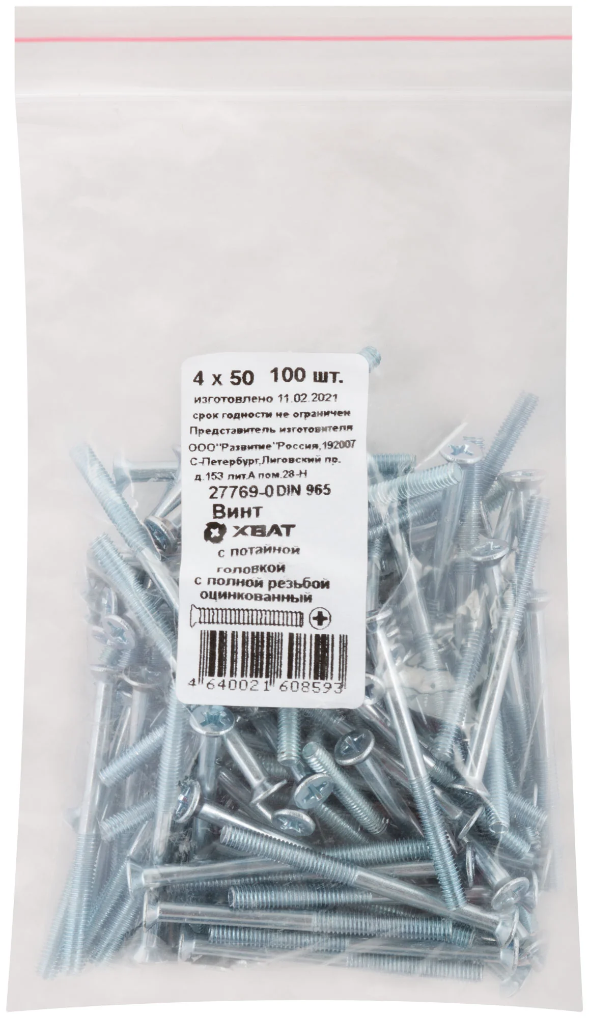 Винт с потайной головкой с полной резьбой оцинкованный DIN 965 4х50 100 шт Фасовка