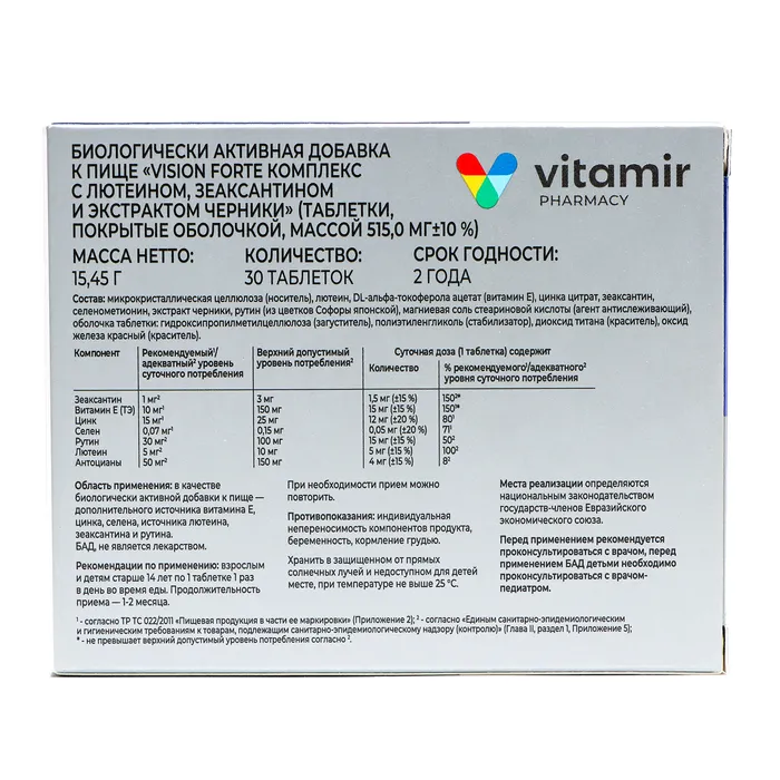 Показания: в качестве биологически активной добавки к пище - дополнительного источника витамина Е, цинка, селена, источника лютеина, зеаксантина и рутина.