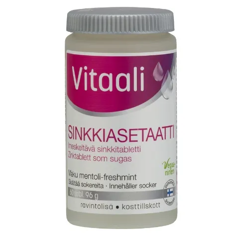 Vitaali sinkkiasetaatti - представляет собой таблетку цинка со вкусом свежей мяты с ментолом и содержит эффективный ацетат цинка.