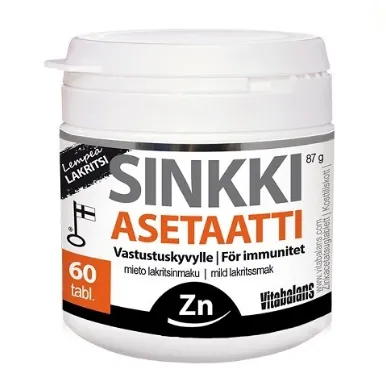 Vitabalans Sinkki Asetaatti - таблетки для рассасывания с цинком для укрепелния иммунитета, имеют лакричный вкус. Цинк способствует нормальному функционированию иммунной системы. Иммунная система поддерживает иммунитет и защищает организм от вирусов и бактерий. Цинк необходим для развития, дифференцировки и функционирования лейкоцитов иммунной системы. Ионы цинка также действуют локально в горле, чтобы усилить иммунитет. Ацетат цинка - лучшая форма цинка в таблетке, когда требуется эффективная доза цинка в области горла. Ацетат не связывает цинк, но высвобождает 100% ионов цинка в слюне, что позволяет цинку локально воздействовать на вирусы в слизистой оболочке глотки.