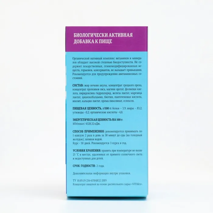 Органический нативный комплекс витаминов и минералов обладает высокой степенью биодо­ступности, полным усвоением и многоплановым регулирующим действием на функции и состоя­ние органов пищеварительной, иммунной, эндо­кринной, костно-мышечной, сердечно-сосудис­той, мочеполовой, бронхолегочной систем. Курсовое применение биогенного витаминно­минерального комплекса обеспечивает поступ­ление адекватных суточных норм витаминов и минералов, биологически активных веществ, необходимых для поддержания обменных про­цессов, предотвращения гормональных сбоев, нарушения массы тела, снижения тонуса мышц, кожи. Сбалансированный витаминно-минеральный состав обладает синергичным действием и совместимостью компонентов, быстро проникает в кровяное русло и оказывает направленное корректирующее действие при индивидуальных нарушениях в результате дисбаланса витаминно­минерального депо организма. Не содержит лекарственных, генномодифицированных веществ, гормонов, консервантов. Не вызывает привыкания. Рекомендуется для предупреждения авитами­нозных состояний. Курс — 30 дней. Рекомендуется 3 курса в год.