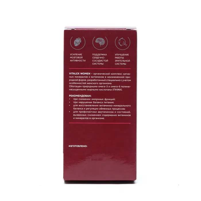 VITALEX WOMEN — органический комплекс на­тивных минералов и витаминов в неизмененной природной форме, разработанный специально с учетом особенностей женского организма. Обогащен природными омега-3 и омега-6 полиненасыщенными жирными кислотами (ПНЖК).