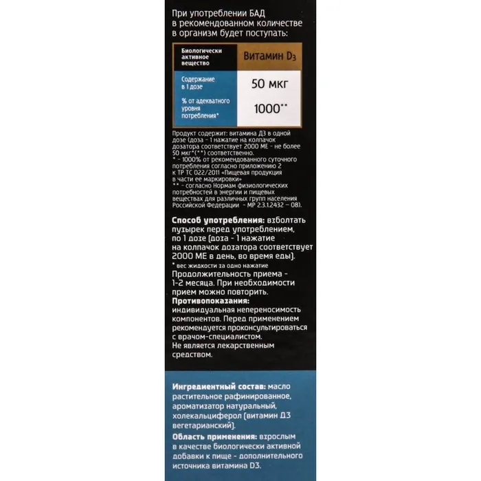 Витамин Д3 2000 МЕ Будь Здоров! с дозатором, 30 мл — Характеристики