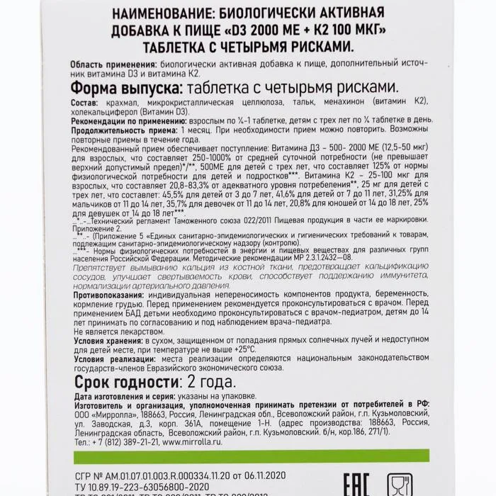 Состав: крахмал, микрокристаллическая целлюлоза, тальк, менахинон (витамин К2), холекальциферол (Витамин D3).