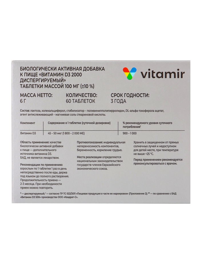 Витамин Д3 «Витамир» 2000 МЕ, диспергируемый, поддержка иммунитета, костей и зубов, 60 таблеток — Характеристики