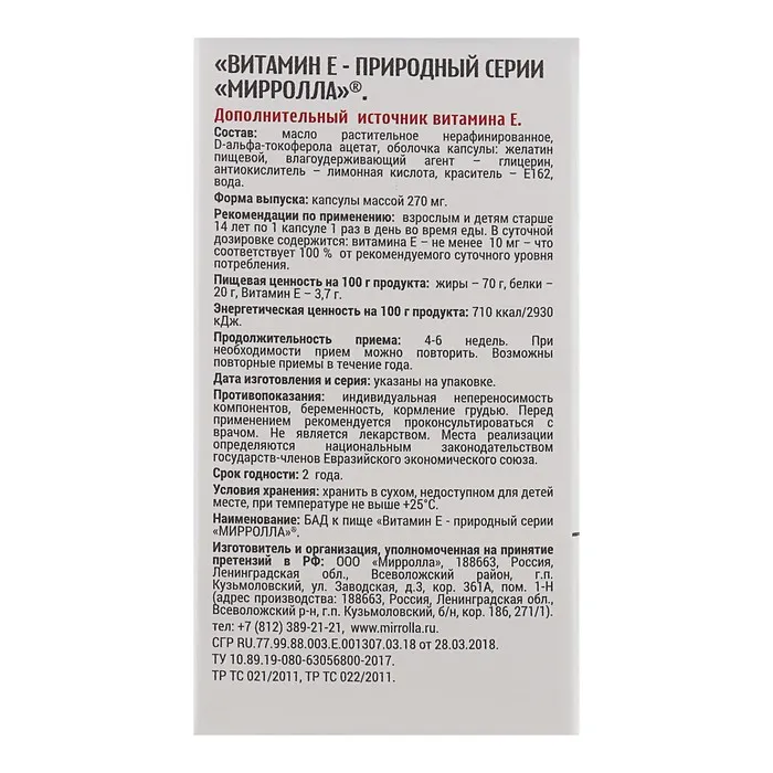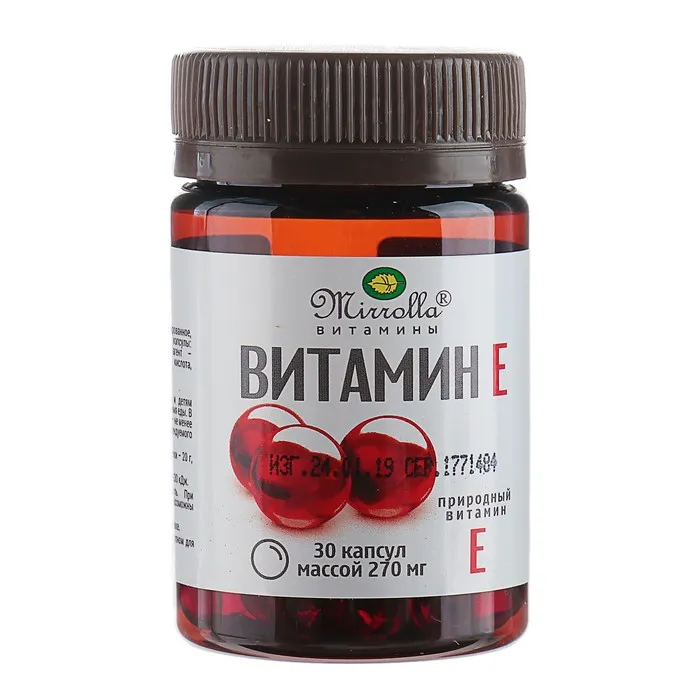 Витамин Е Mirrolla, токоферол природный, 30 капсул — Характеристики