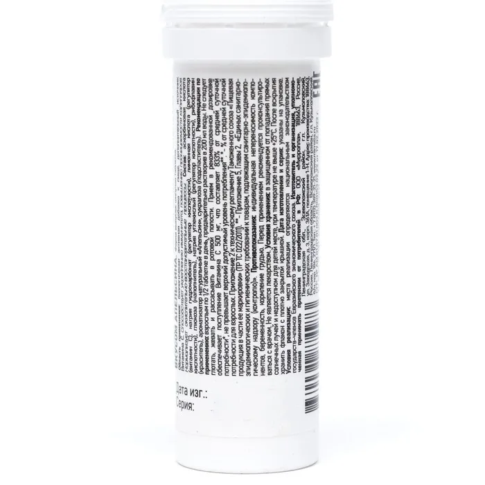 Состав: Аскорбиновая кислота (витамин С), натрия гидрокарбонат (регулятор кислотности), лимонная кислота (регулятор кислотности), глюкоза (наполнитель), натрия углекислый (регулятор кислотности), рибофлавин (краситель), ароматизатор натуральный «Апельсин», сукралоза (подсластитель).