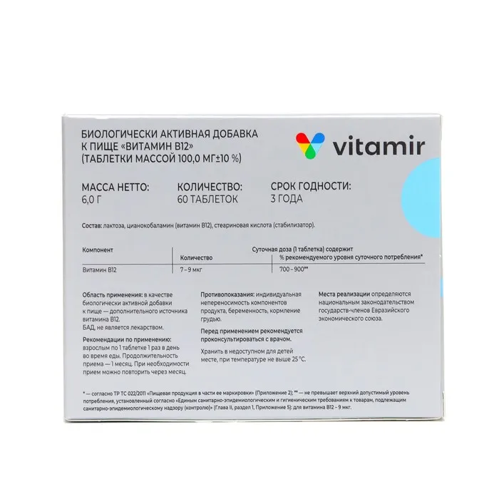 Состав: лактоза, цианокобаламин (витамин В12), стеариновая кислота (стабилизатор).