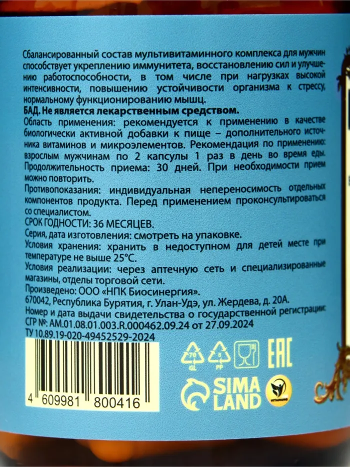 В качестве биологически активной добавки к пище - дополнительного источника витаминов и микроэлементов, обеспечивающих организм мужчины жизненно необходимыми витаминами и минералами, стимулирующей жизненные силы и сексуальные возможности, активности и выносливости организма, повышению умственной и физической работоспособности, снижению риска сердечно-сосудистых заболеваний, поддерживающей при обострении хронических заболеваний.