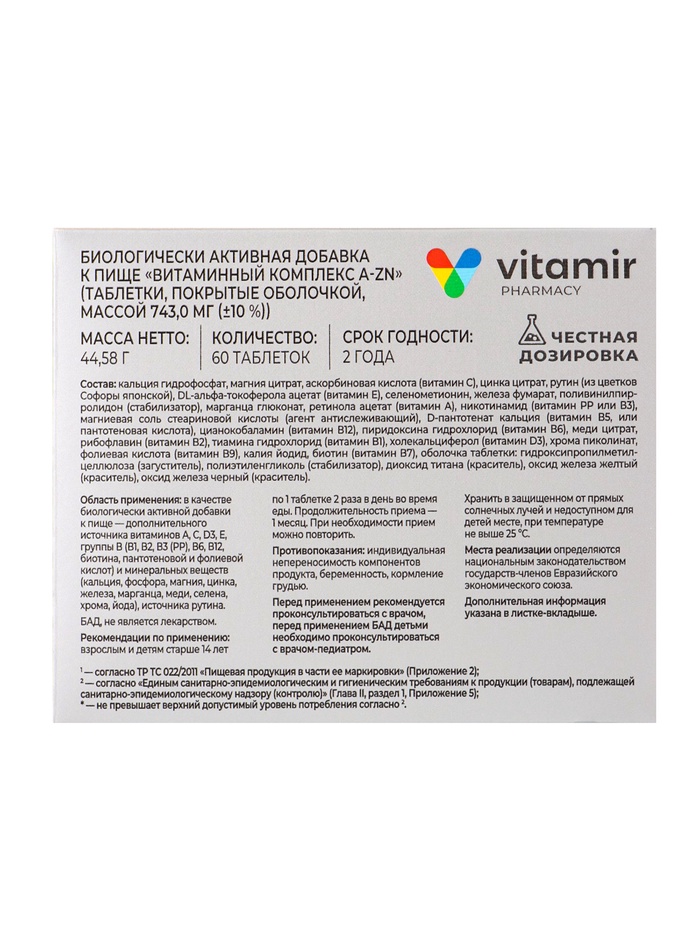 Витаминно-минеральный комплекс «Витамир» A–Zn, для укрепления иммунитета и поддержания энергии, 60 таблеток — Характеристики
