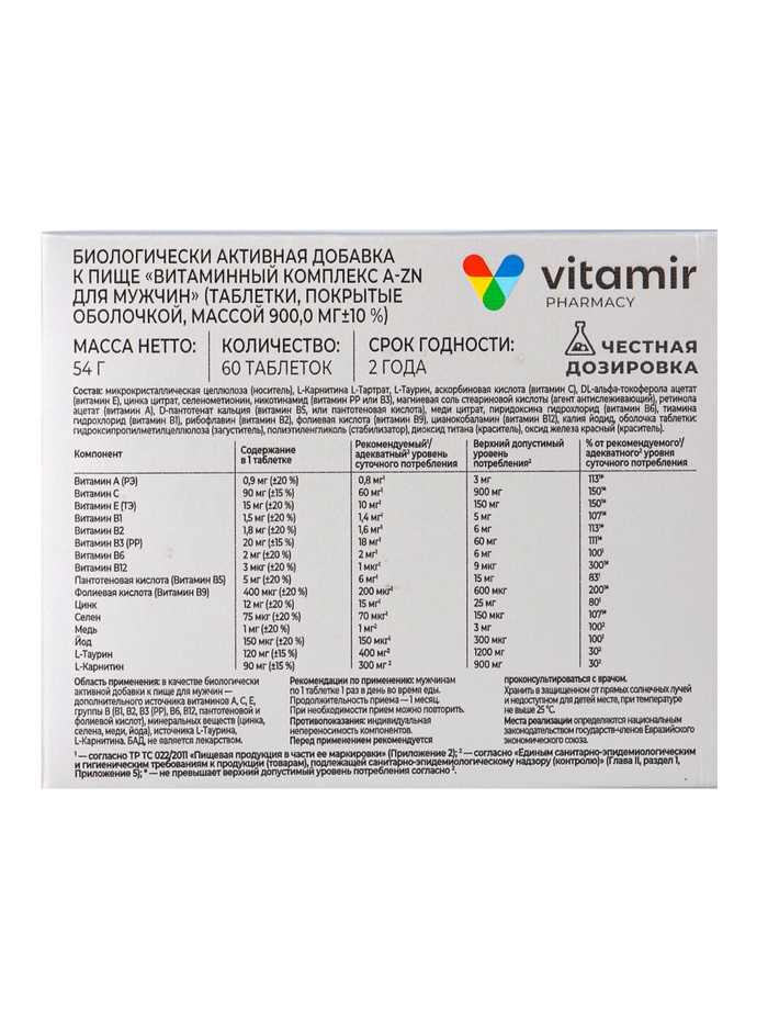 Витаминный комплекс A–Zn «Витамир» для мужчин, поддержка иммунитета, энергии и мужского здоровья, 60 таблеток — Характеристики