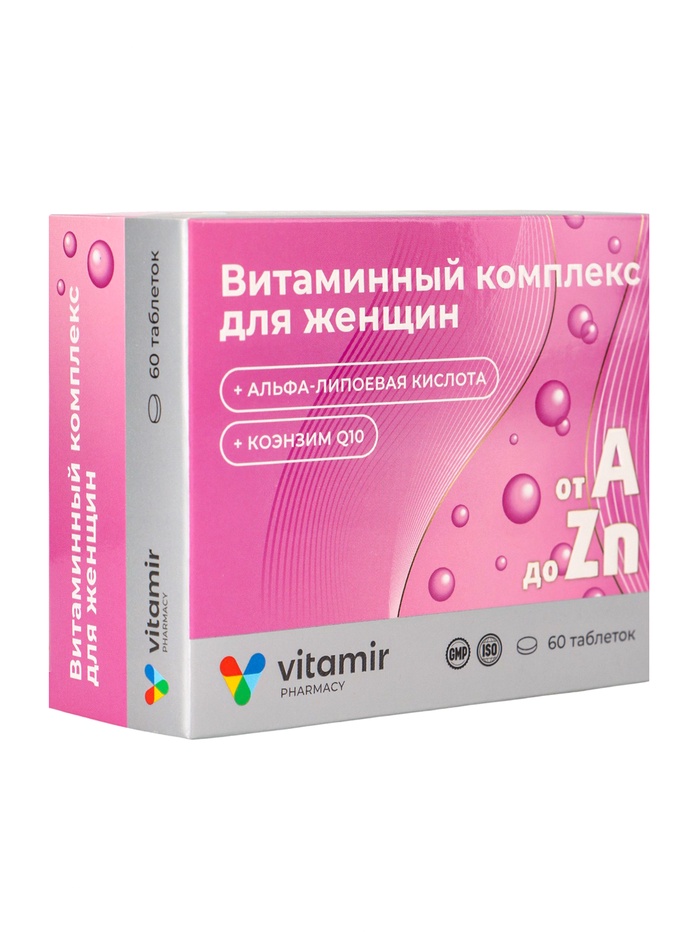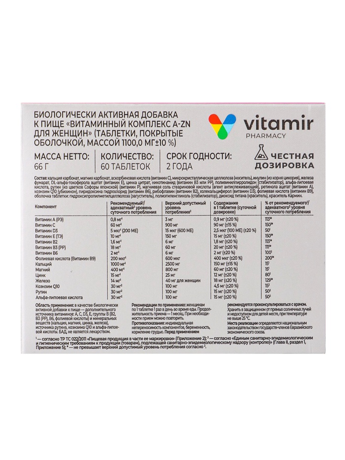 Витаминный комплекс A–Zn «Витамир» для женщин, поддержка иммунитета, энергии и женского здоровья, 60 таблеток — Характеристики