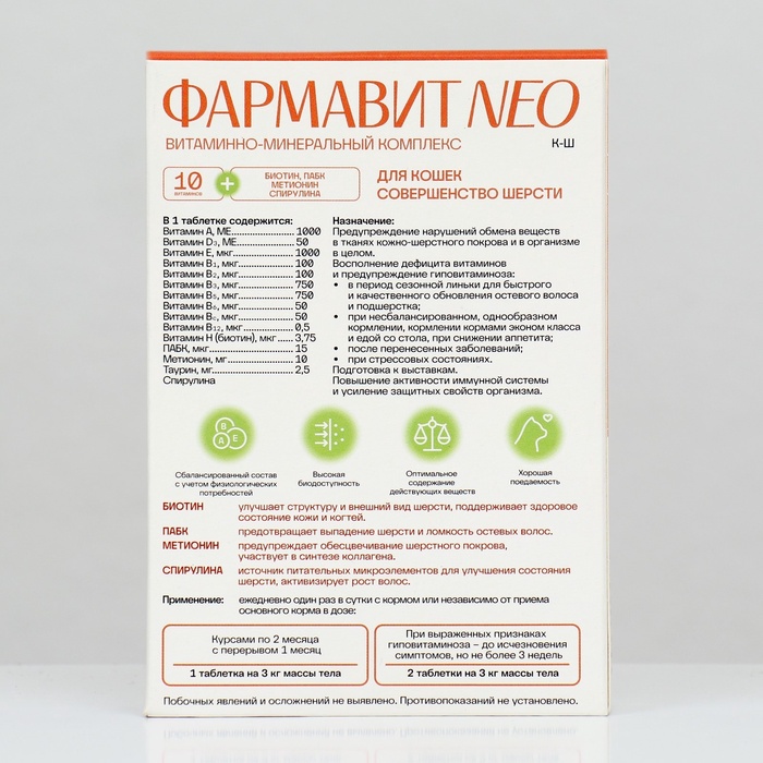 Биологические свойства кормовой добавки обусловлены наличием витаминов, аминокислот, спирулины, включенных в её состав в оптимальном соотношении и с учетом физиологической потребности кошки. Кроме того, в состав кормовой добавки входят пивные дрожжи, в которых высокое содержание витаминов группы B, легкоусвояемого белка, содержащего все незаменимые аминокислоты, незаменимые жирные кислоты, макро- и микроэлементы, такие как магний, железо, марганец, цинк и др.